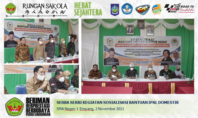 Empang, 2 November 2021, Kegiatan  Sosialisasi dan sekaligus launching IPAL (Instalasi Pengolahan Air Limbah) Domestik yang dipusatkan di SMA Negeri 1 Empang berjalan lancar. Berawal dari komunikasi intens yang dilakukan oleh pihak Sekolah dengan  Bapak Saifullah, S.Pd. Selaku ketua Komisi I DPRD Kabupaten Sumbawa pada bulan Februari 2021, dimana beliau sebagai keluarga besar SMAN 1 Empang (alumni terbaik tahun 1998) merasa bertanggung jawab terhadap lembaga yang telah membesarkannya. Kemudian lebih lanjut disusul dengan Surat Permohonan kepada Kementerian Lingkungan Hidup dan Kehutanan untuk mendapatkan bantuan IPAL Domestik yang dalam hal ini dikawal langsung oleh bapak Haji Johan Rosihan, ST. Selaku anggota Komisi IV DPR RI dari dapil pulau Sumbawa, yang nota bene beliau adalah salah satu putra terbaik Kecamatan Empang. Sehingga berselang 6 bulan kemudian tepatnya di bulan Agustus 2021 turun tim survey lokasi dari kementerian KLHK. Disusul dengan pengerjaan proyek IPAL Domestik di 3 titik di Kabupaten Sumbawa yaitu di SD Baru Kecamatan Moyo Utara, SMP Negeri 1 Empang dan SMA Negeri 1 Empang pada bulan Oktober. Maka sebagai rangkaian dari suksesnya pembangunan tersebut, diselenggarakanlah Kegiatan Sosialisasi Pengelolaan IPAL Domestik yang dipusatkan di SMA Negeri 1 Empang, pada hari Selasa 2 November 2021.