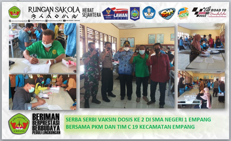 Setelah melakukan komunikasi yang intens antara pihak sekolah (Tim C-19 bersama Pejabat Waka Humas Muhammad Faesal, SE) dengan pihak PKM Kecamatan Empang dan Tim C-19 Kecamatan Empang, disepakatilah untuk pemberian vaksinasi kedua pada hari Jumat (17/12) yang bertempat di laboratorium fisika. Kegiatan tersebut dimulai pukul 08.00 WITA dihadiri oleh Kepala Puskesmas Empang H. Irfan Agung Rianto, S.Kep, Kapolsek Empang Iptu Nakmin , Plt. Camat Empang Sirajuddin, SH, Babinsa Desa Bunga Eja Serda Abdul Farid dan didampingi oleh Waka Kurikulum Mahfud, S.Pd mewakili Kepala Sekolah yang sedang Raker di Mataram sebagai satu kesatuan Tim Penanganan Covid-19 Kecamatan Empang.
